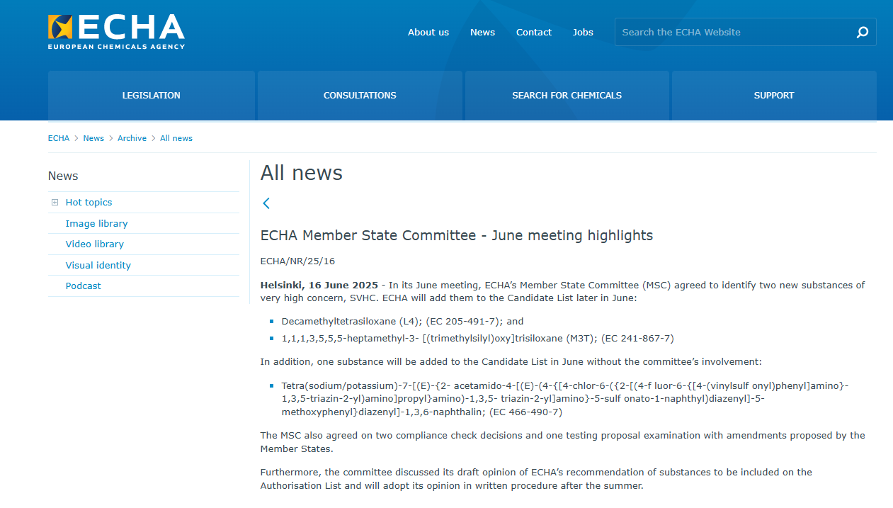 2025年6月16日,欧洲化学品管理局(ECHA)宣布将在6月底将3项物质列入新一批SVHC候选物质清单。届时,SVHC候选清单物质将增加至250项。